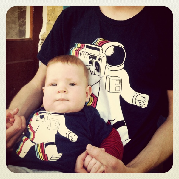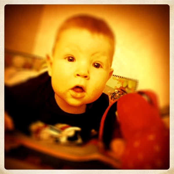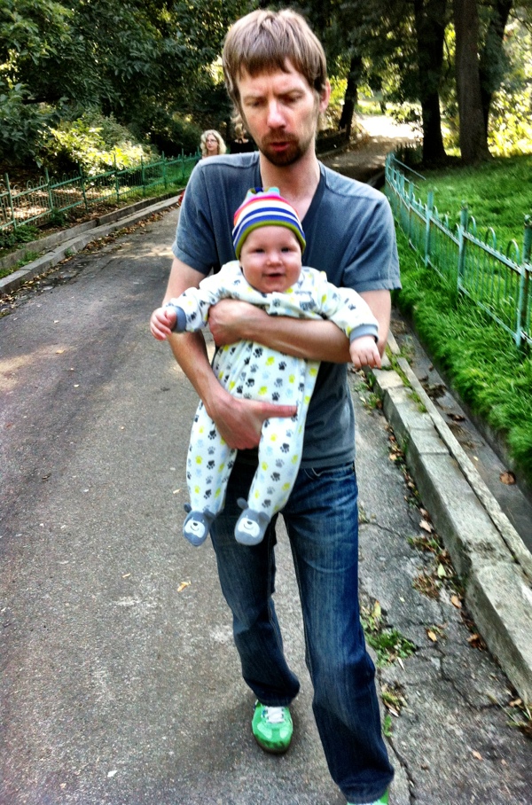 Сегодня гуляли 3 часа подряд( из них спали час и 2 глазели по сторонам) дошли до Владимирской горки и обратно, потеряли ботик и снова нашли, жевали папкину кофту и улыбались всем прохожим))